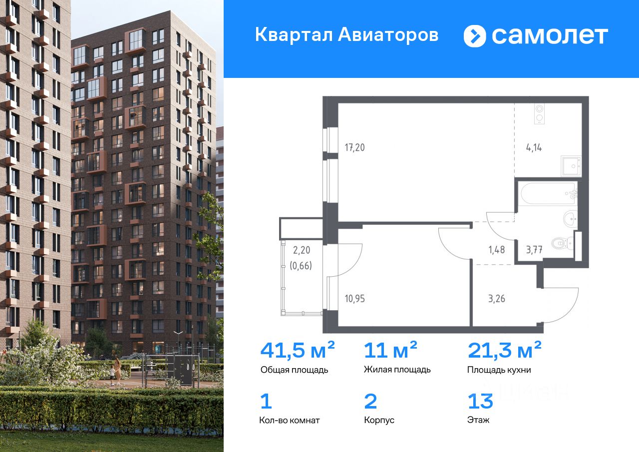 Предлагается 1-комнатная квартира комфорт-класса 41,46 кв.м в корпусе 2 на 13 этаже, в ЖК ''Квартал Авиаторов''