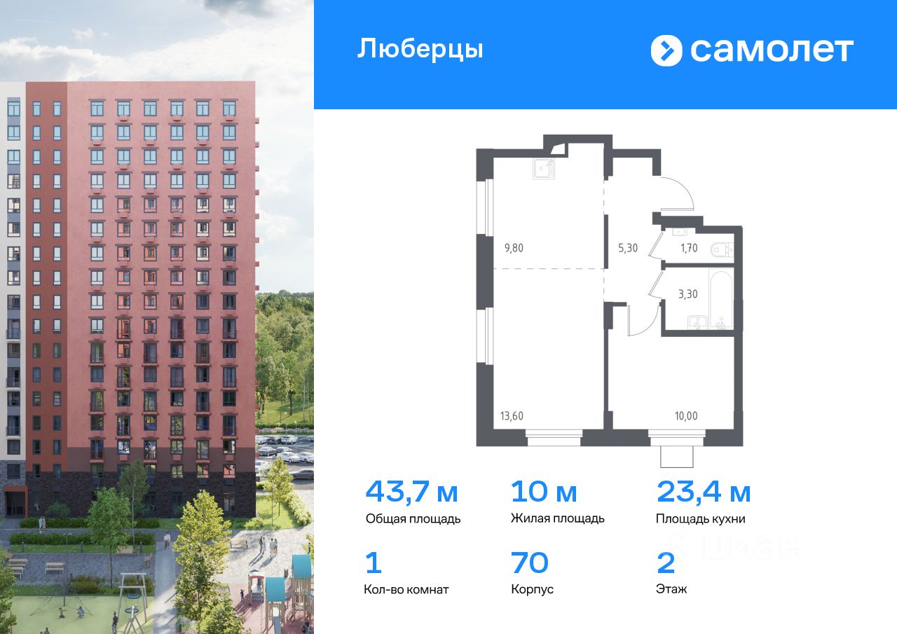 Предлагаются 1-комнатные апартаменты комфорт-класса 43,7 кв.м в корпусе 70 на 2 этаже, в ''Люберцы''
