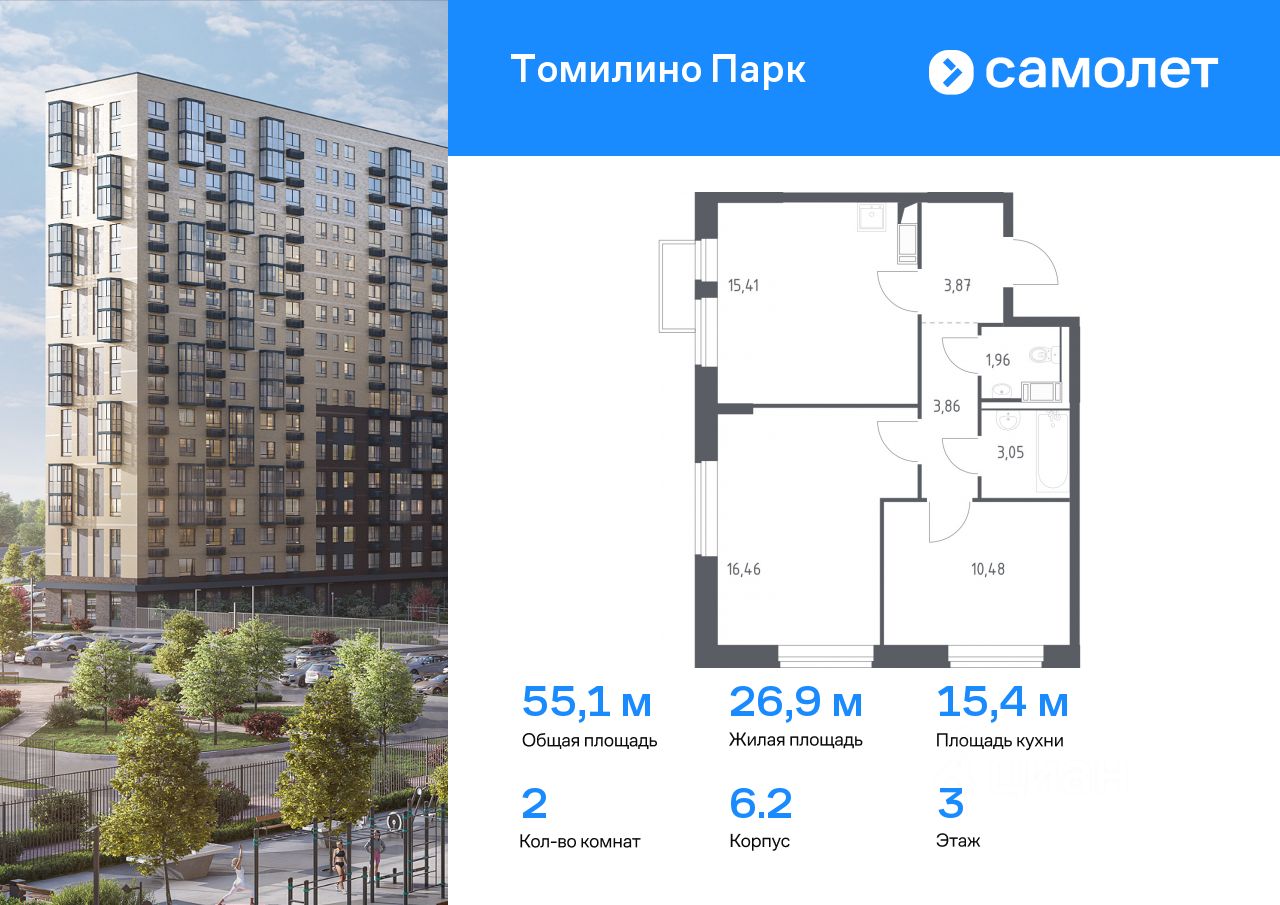 Предлагается 2-комнатная квартира комфорт-класса 53,8 кв.м в корпусе 6.2 на 3 этаже, в ЖК ''Томилино Парк''