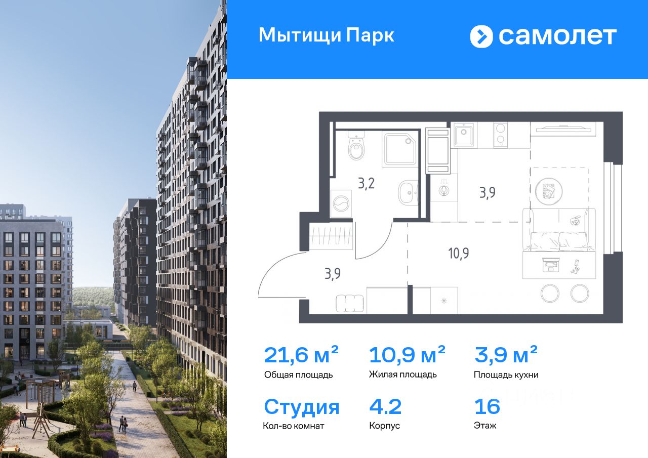 Строим кварталы для жизни с заботой о будущем. Предлагается квартира студия комфорт-класса 21,6 кв.м в корпусе 4.2 на 16 этаже, в ЖК ''Мытищи Парк''