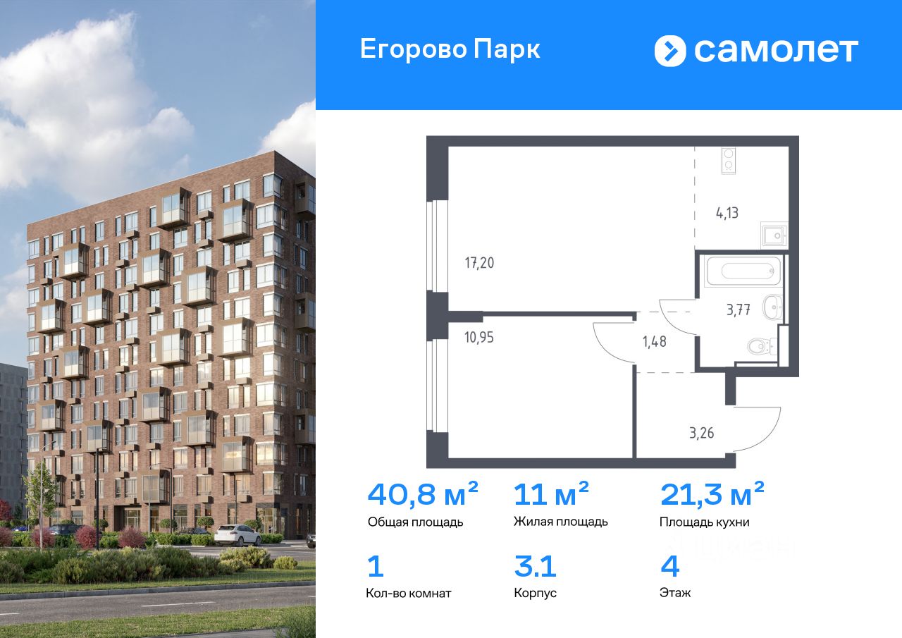 Строим кварталы для жизни с заботой о будущем. Предлагается 1-комнатная квартира комфорт-класса 40,79 кв.м в корпусе 3.1 на 4 этаже, в ЖК ''Егорово Парк''