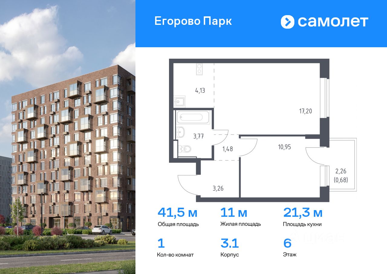 Предлагается 1-комнатная квартира комфорт-класса 41,47 кв.м в корпусе 3.1 на 6 этаже, в ЖК ''Егорово Парк''