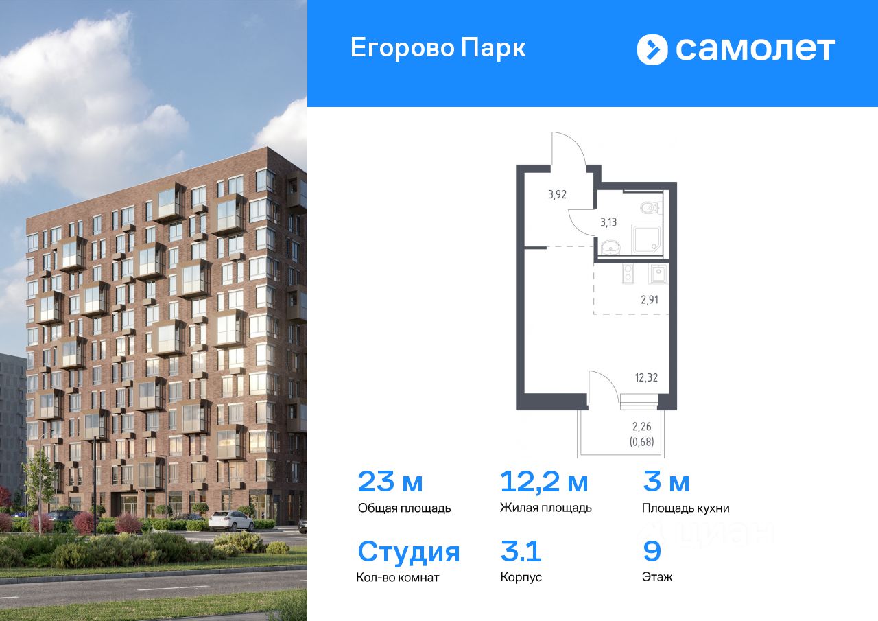 Предлагается квартира студия комфорт-класса 22,96 кв.м в корпусе 3.1 на 9 этаже, в ЖК ''Егорово Парк''
