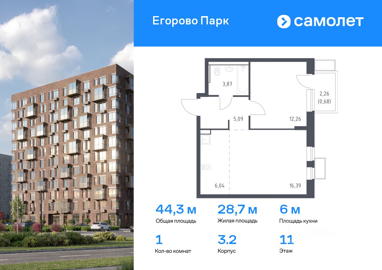 Предлагается 1-комнатная квартира комфорт-класса 44,33 кв.м в корпусе 3.2 на 11 этаже, в ЖК ''Егорово Парк''