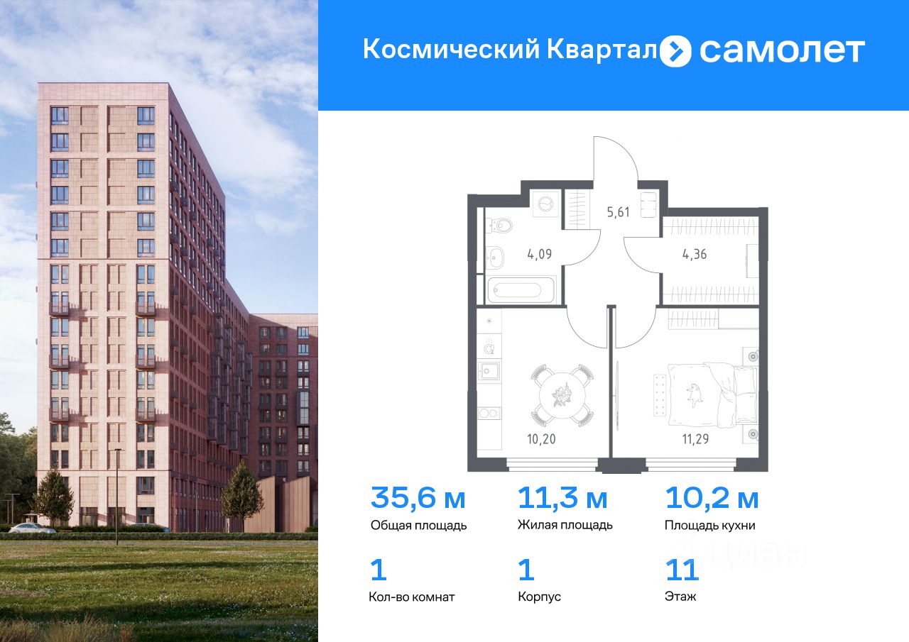Предлагается 1-комнатная квартира комфорт-класса 35,55 кв.м в корпусе 1 на 11 этаже, в ЖК ''Космический Квартал'' Квартира без отделки. Доступность опции ''отделка'' и возможность комплектации мебелью и декором уточняйте у застройщика.