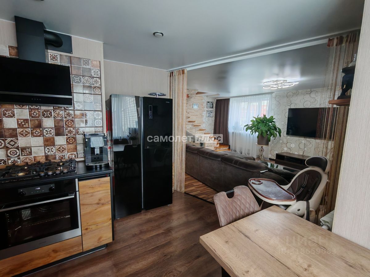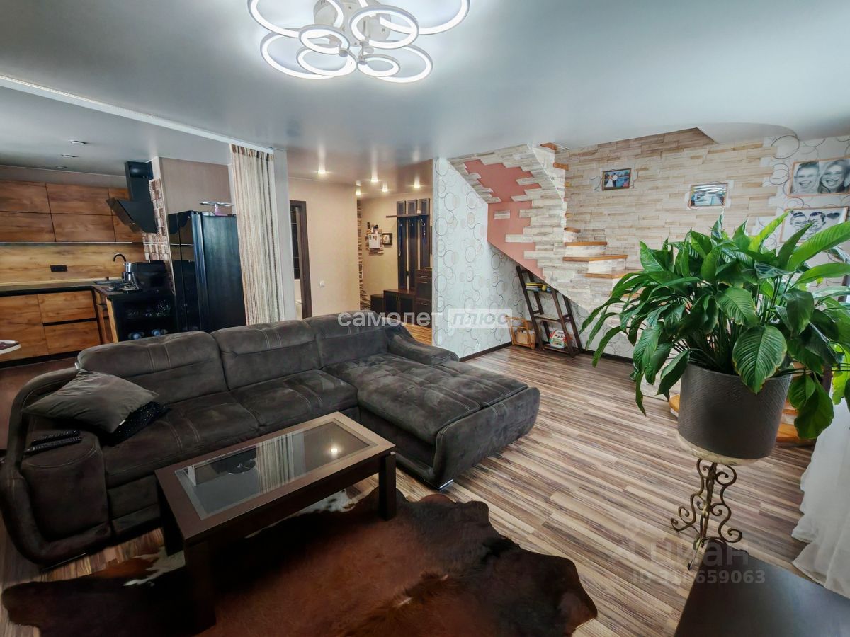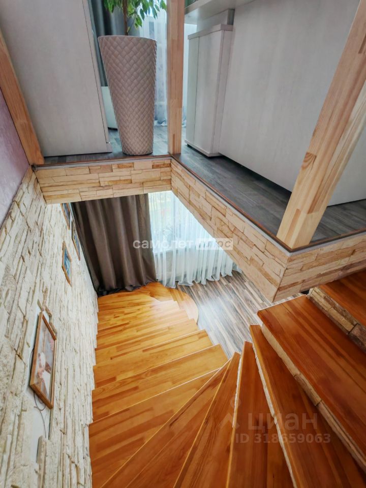 - на 1-м этаже просторная прихожая, гостиная, объединенная с кухней, оборудованной встроенной мебелью и техникой, санузел, лестница на 2-й этаж