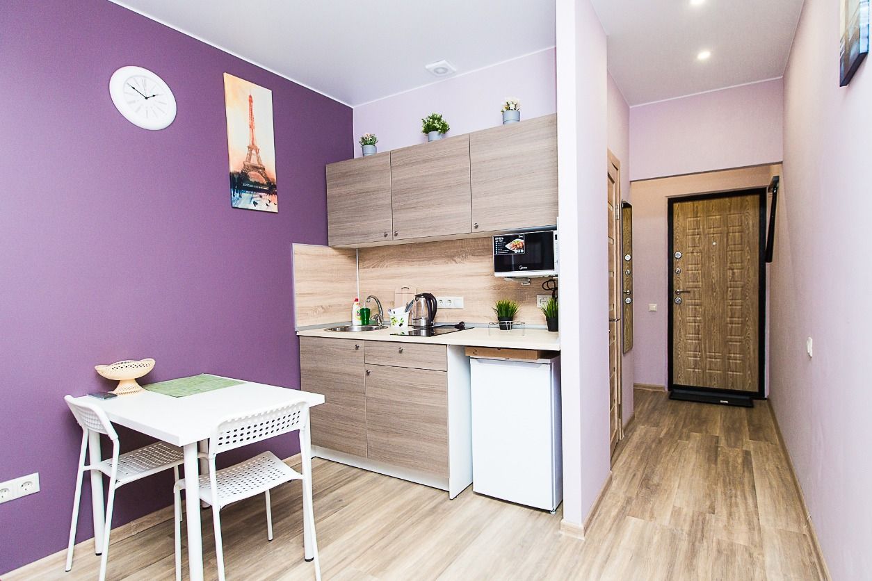 * Современный дизайнерский ремонт. Это не просто ''бабушкины'' обои в цветочек, а новые чистые стены, стильная отделка с грамотно расставленными акцентами. * Полный комплект мебели: двуспальная кровать, стол, стулья, кухонный гарнитур и т.д. * Ортопедический матрас для удобного отдыха. * Бытовая техника: варочная панель, холодильник, микроволновка, стиральная машина, телевизор, Wi-Fi.