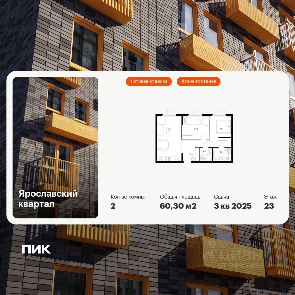 Продаётся 2-комн. квартира площадью 60,3 кв.м на 23 этаже 24 этажного дома (Корпус 1.3, Секция 1) проекта ПИК Ярославский квартал. Светлый просторный подъезд на уровне земли, функциональная планировка, большие окна, c отделкой.