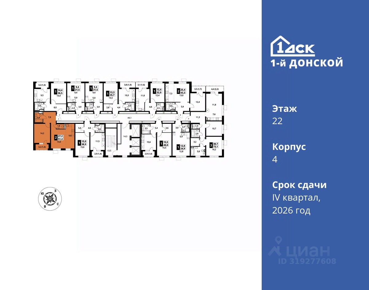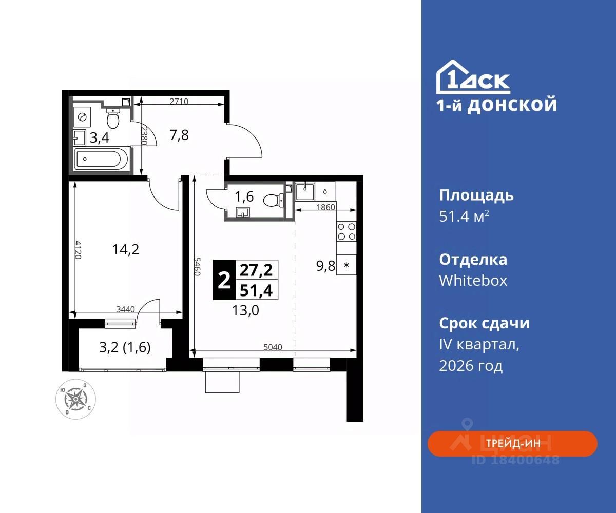 Общая площадь51,4 м2