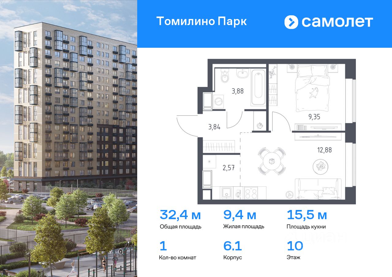 Предлагается 1-комнатная квартира комфорт-класса 32,4 кв.м в корпусе 6.1 на 10 этаже, в ЖК ''Томилино Парк''