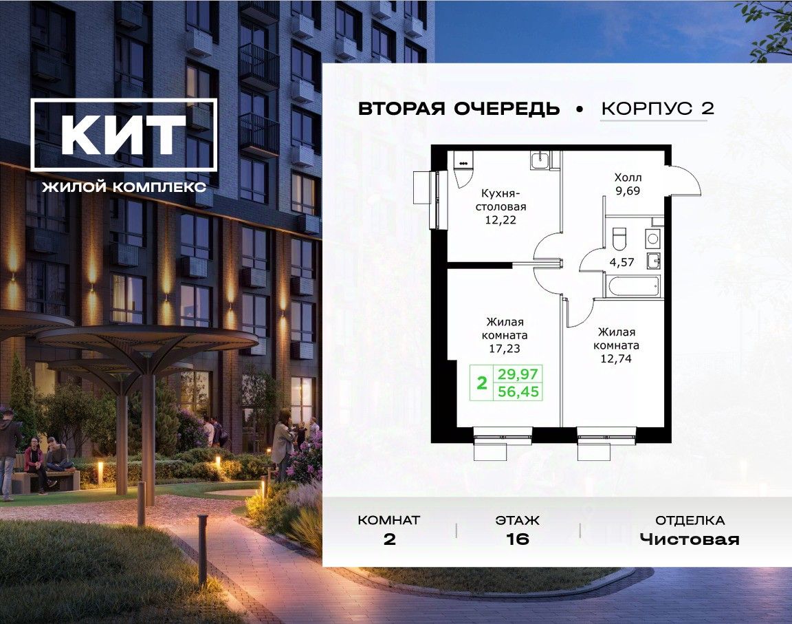Продаётся 2-к квартира 56.45 кв.м. с чистовой отделкой в ЖК ''КИТ2'' на 16-м этаже 25 этажного дома.Жилой комплекс ''Кит 2'' спроектирован в урбанистической концепции ''Город в Городе''. Объект бизнес-класса предлагает рациональный подход к набору опций, необходимых для гармоничной жизни. Проект представляет собой два корпуса, которые образуют единую приватную территорию. Ее доминантой является двор с красивым ландшафтным дизайном и различными зонами, ориентированными на интересы жителей разного возраста. При создании пространства в приоритет ставился комфорт жителей. В шаговой доступности находятся: торговый центр, рестораны, кинотеатры, спортивный зал, образовательные учреждения и множество других объектов в сфере услуг.