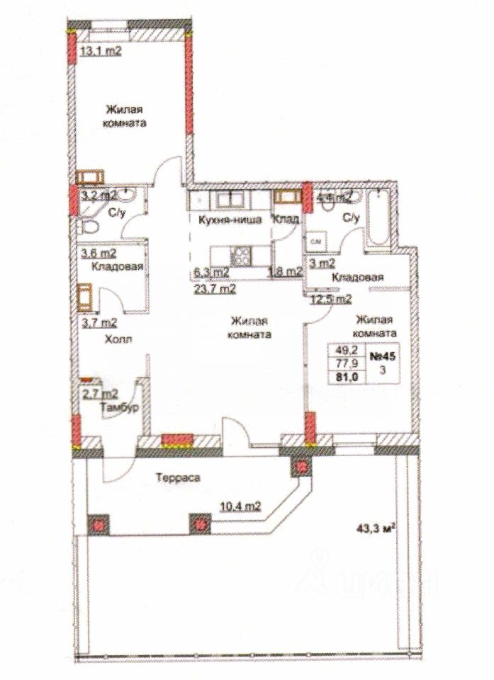 Арт. 110914139 3-кoмнaтная квартирa в ЖК ''Клюквенный'', oбщeй плoщaдью 79 м2 без ремонта
