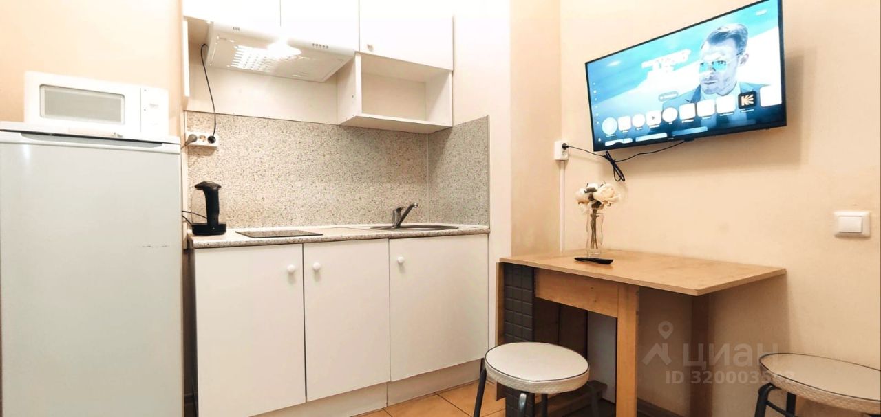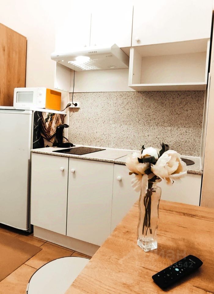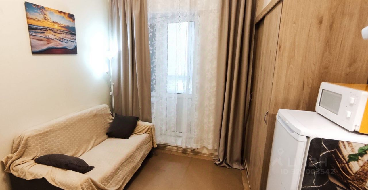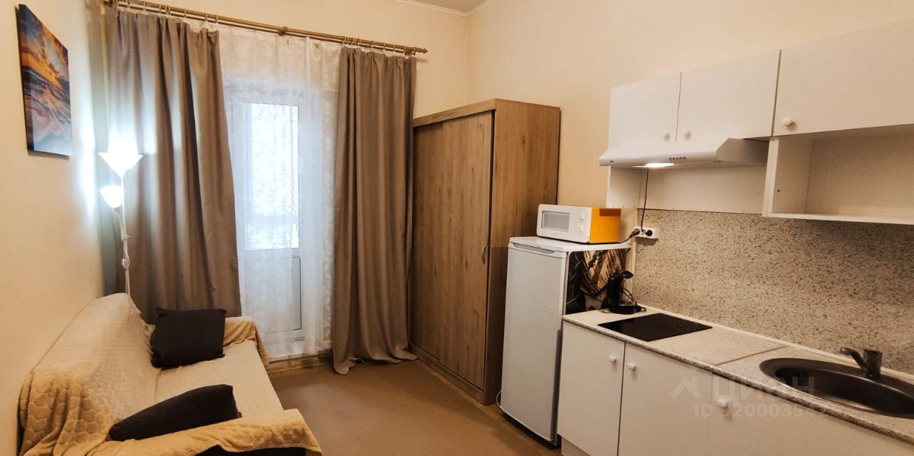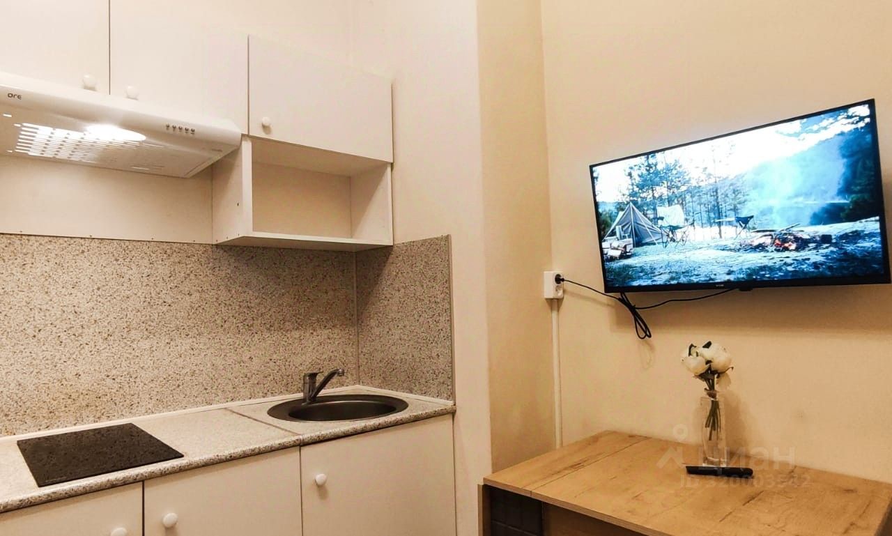 В студии есть всё необходимое для комфортного проживания. Сделан косметический ремонт, что придаёт свежесть и уют. Пространство студии обустроено с умом: есть вся необходимая мебель, а также техника — холодильник, микроволновка, варочная панель, телевизор. В санузле установлена ванна и стиральная машина. Окна выходят во двор, поэтому в студии тихо и спокойно.