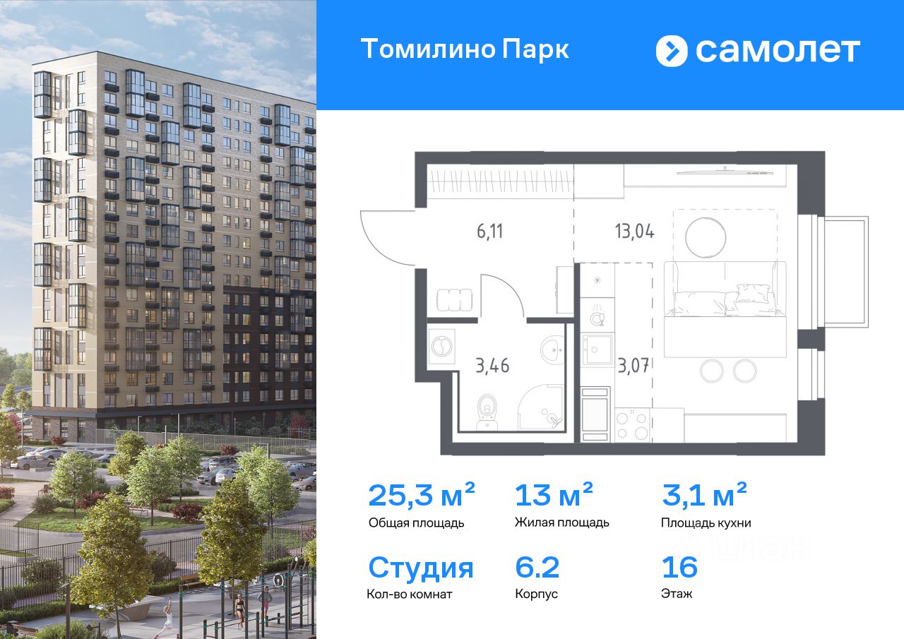 Предлагается квартира студия комфорт-класса 25,3 кв.м в корпусе 6.2 на 16 этаже, в ЖК ''Томилино Парк''