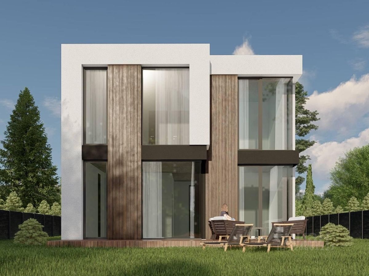 Панорамные окна. Высота потолков 3 м. Стены возведены из газобетонного блока D500 толщиной 400 мм. Наружная отделка с декоративными вставками из планкена. Фундамент монолитная плита с теплым полом. Плоская кровля.