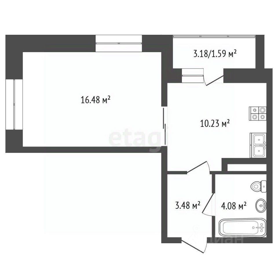 Комната - 16,4 кв. метра. Кухня - 10,1 кв. м с выходом на лоджию (3,2 кв. м). Совмещенный санузел более 4 кв. м, где помещаются и полноценная ванная, и стиральная машина. Прихожая - 3,5 кв. метра.